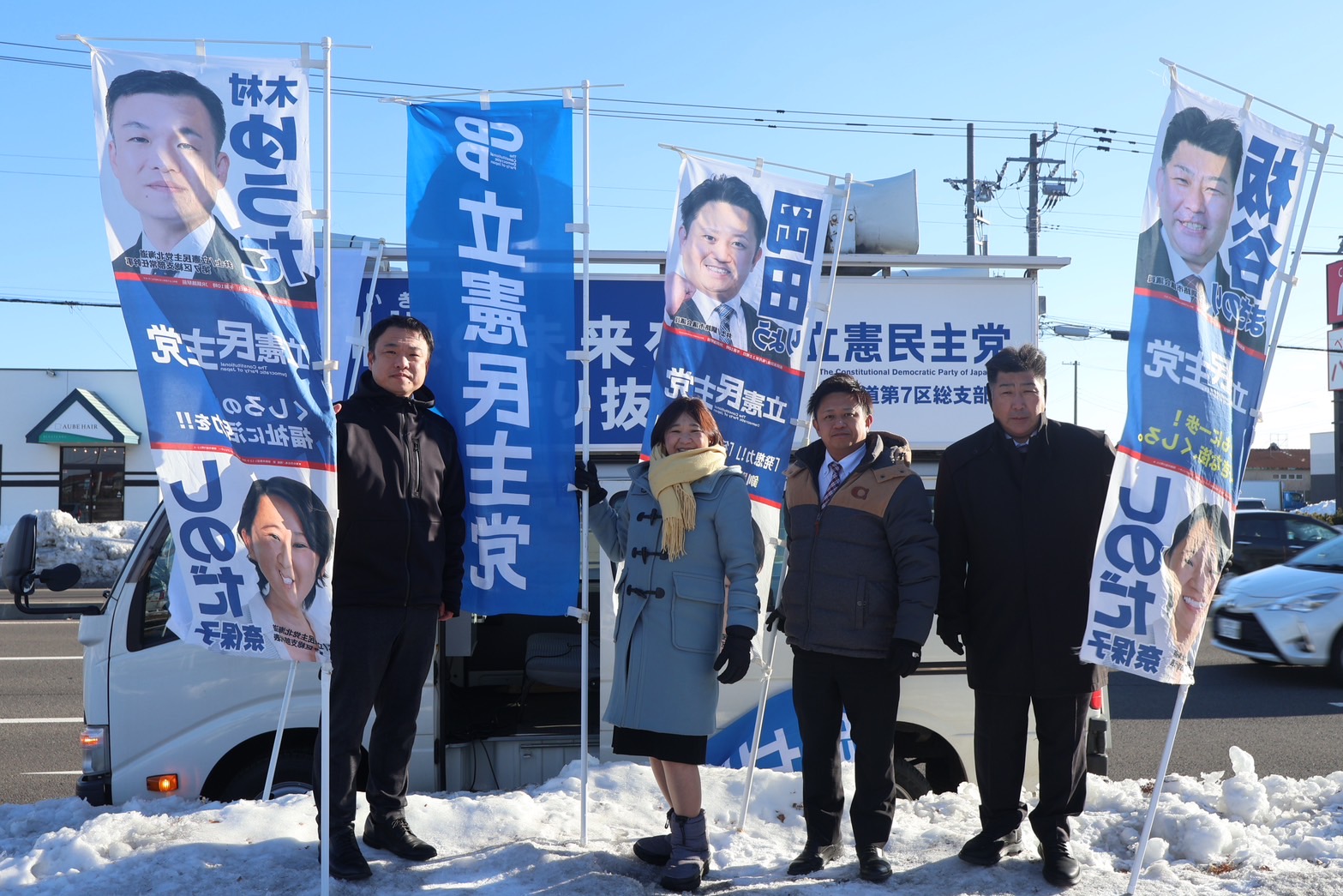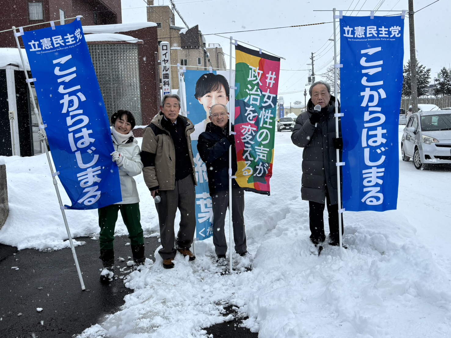 第7区 木村勇太(釧路市議)、しのだ奈保子代表(衆議)、岡田遼(道議・釧路市)、板谷昌慶(釧路市議)【イオン釧路店前】