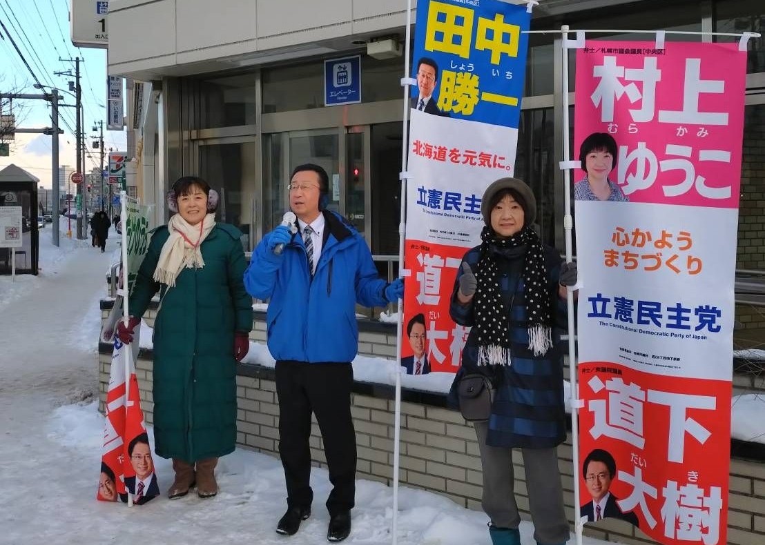 第1区 竹内有美(札幌市議・中央区)、田中勝一(道議・札幌市中央区)、村上裕子(札幌市議・中央区)【地下鉄西28丁目駅前】